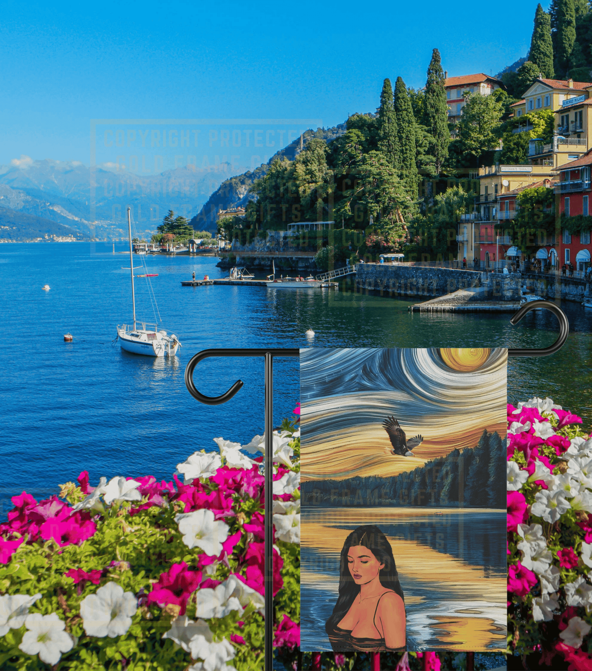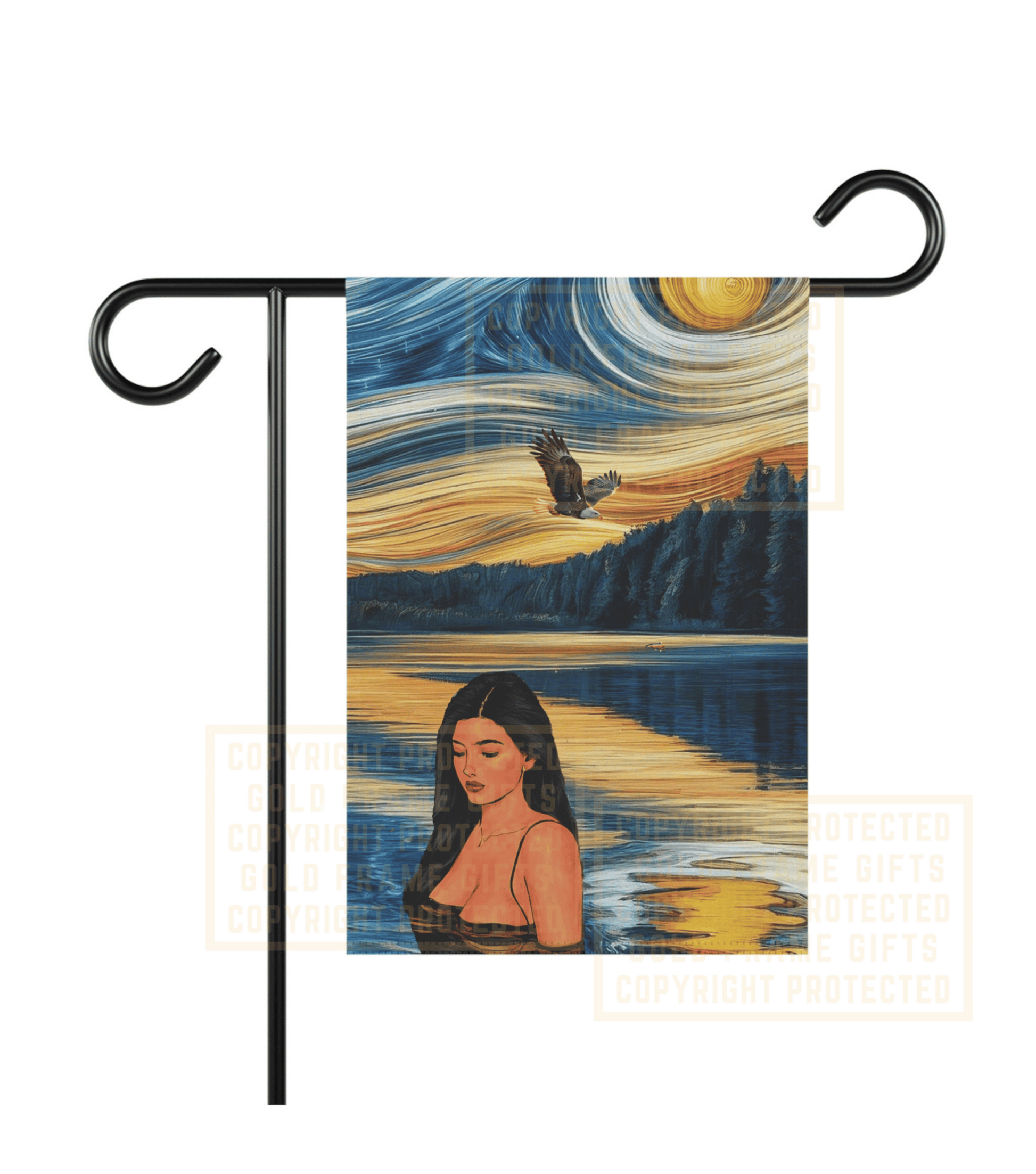 Enhance your house, mailbox, or garden with this high quality banner flag. Made with lightweight yet highly durable poly poplin-canvas fabric, this banners come in size 12'' × 18'' inches and feature a top sleeve for easy placement on poles. Your design goes in crisp detail and color on both sides of the flag. This beautiful Garden & House Banner features a design of a woman swimming in a river at sunset, surrounded by birds, a bald eagle, and fish. It provides a serene and peaceful atmosphere, perfect for adding a touch of summer to your lake house yard. Ideal for housewarming gifts and outdoor decorations. .: 100% Poly poplin-canvas fabric .: Size 12'' × 18'' inch .: Same design printed on both sides, flag flipped over long edge (intended for designs in a vertical orientation) .: Black inside lining .: Features sleeve at top .: Pole, hooks, or fasteners are not included (Please note: The copyright mark on photos will not be on the actual product.) Care instructions - Clean by wiping with a soft, damp cloth.